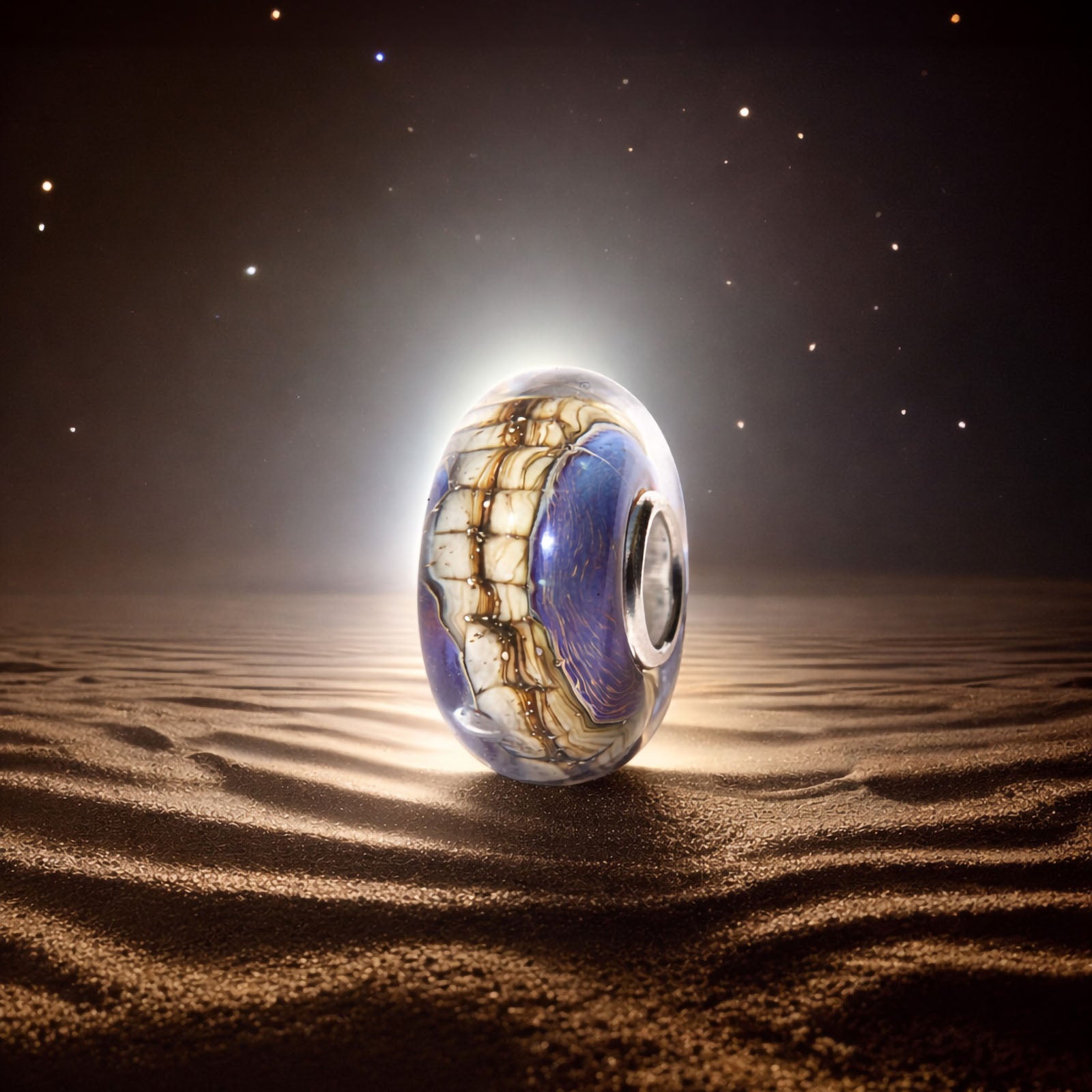 Receive the luminous Elfbeads Halo Snakeskin glass bead as a welcome gift with your first order of $100 or more. Its warm desert shimmer and gentle glow catch the light beautifully on any bracelet.